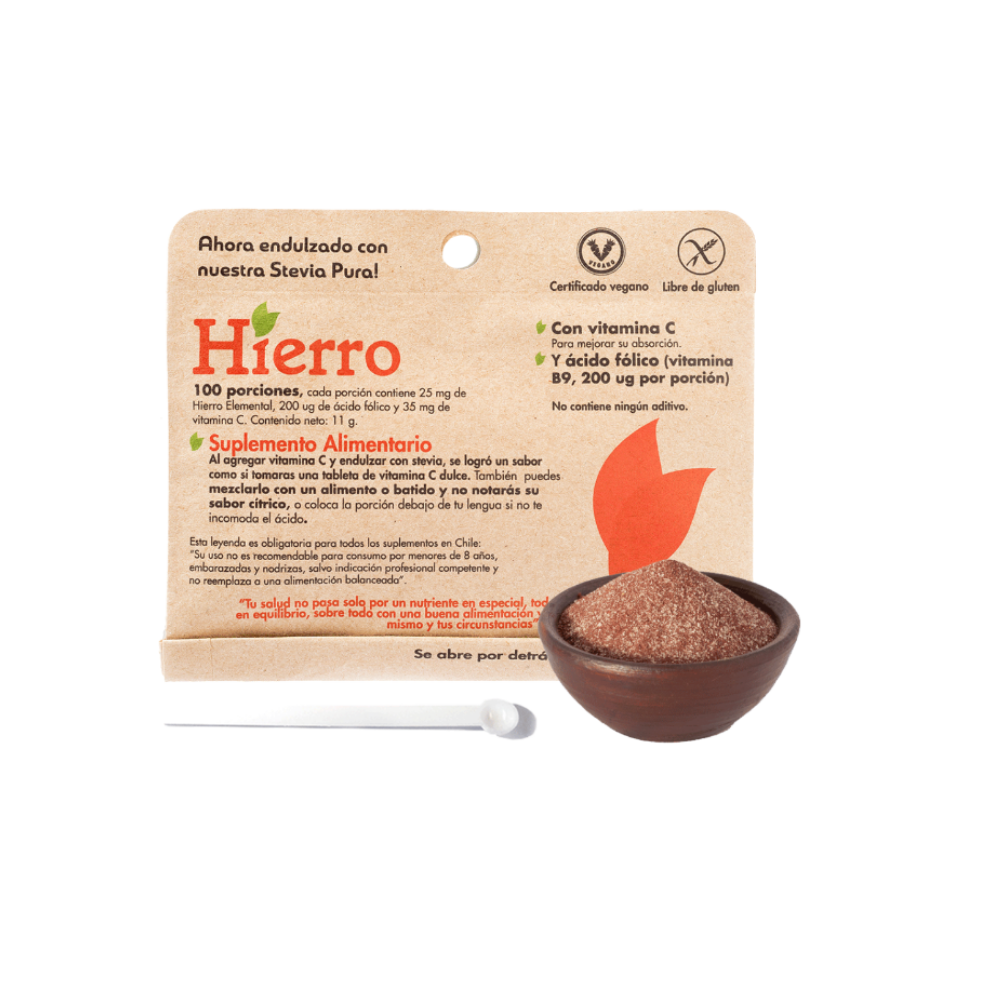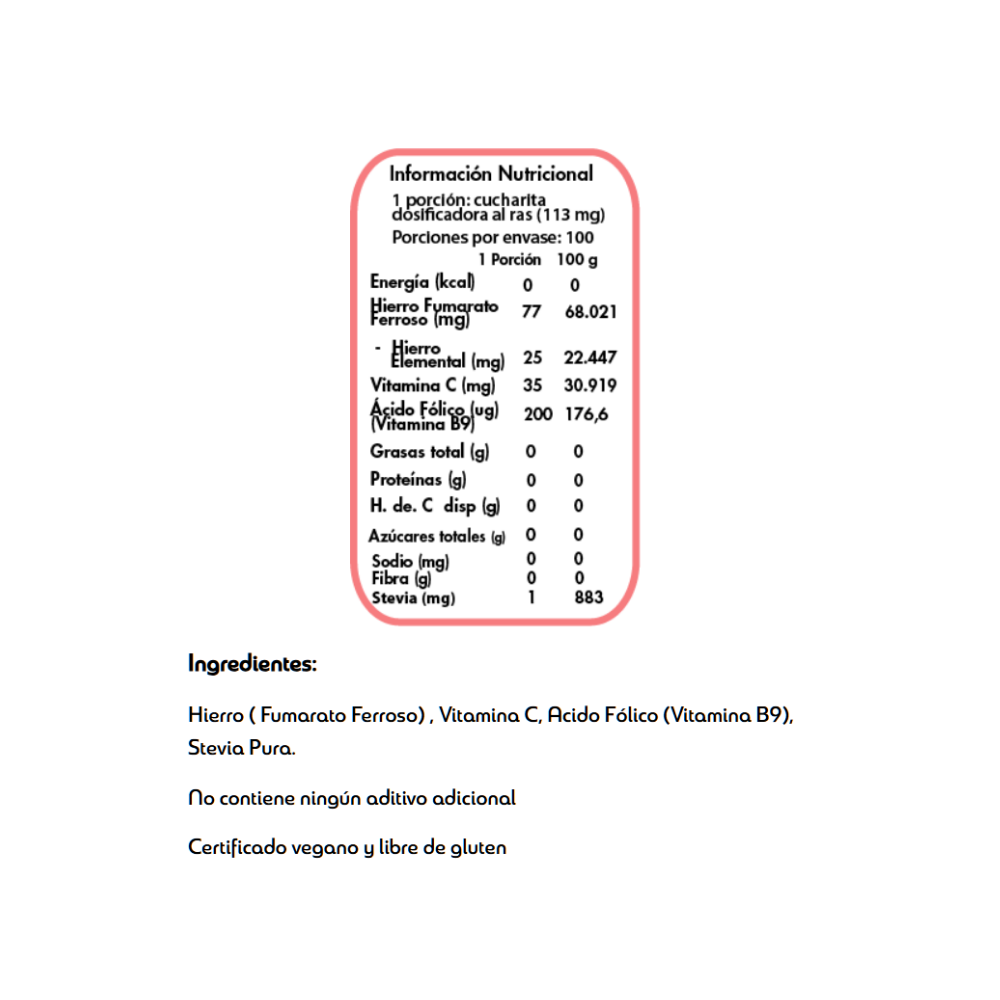 Endulzado con Nuestra Stevia Pura 100 porciones, cada una contiene 25 mg de Hierro Elemental, vitamina C para que se absorba mejor y 200 ug de ácido fólico (vitamina B9) Endulzado con Nuestra Stevia Pura 100 porciones, cada una contiene 25 mg de Hierro Elemental, vitamina C para que se absorba mejor y 200 ug de ácido fólico (vitamina B9)