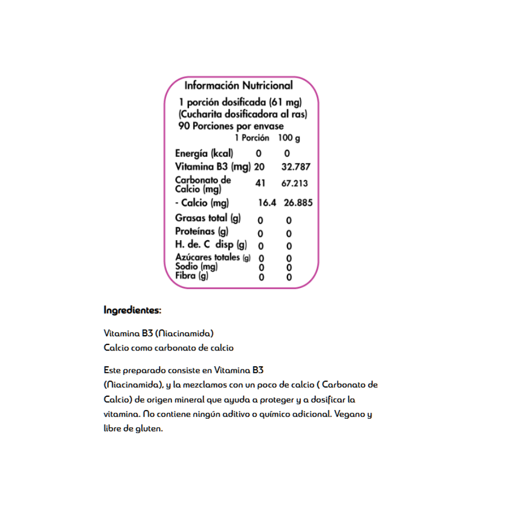 La vitamina B3, esencial para el metabolismo de nutrientes y la producción de energía, contribuye a mantener un equilibrio metabólico saludable. Además, favorece la salud cardiovascular al ayudar en la regulación del colesterol y la protección contra enfermedades cardíacas.
